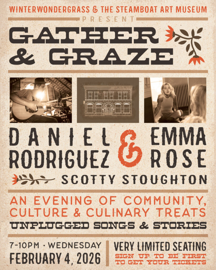 An evening of Community, Culture and Culinary Treats with the songs and stories behind them by Daniel Rodriguez, Emma Rose and Scotty Stoughton. This elegant event will feature local bites created with the products of Steamboat and wine of Colorado. Included in the ticket price are the food offerings, wine tastings and non alcholic mocktails.
