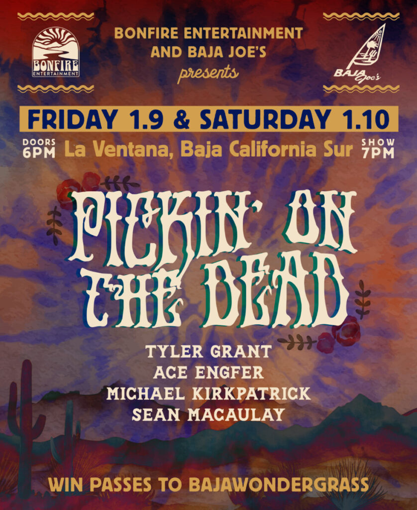 Join us for a special event at Baja Joe’s in La Ventana, featuring Tyler Grant, Ace Engfer, Michael Kirkpatrick, and Sean Macaulay! Raffles for BajaGrass festival tickets, and Tropic of Cancer tickets. Doors 6 pm / Show 7 pm